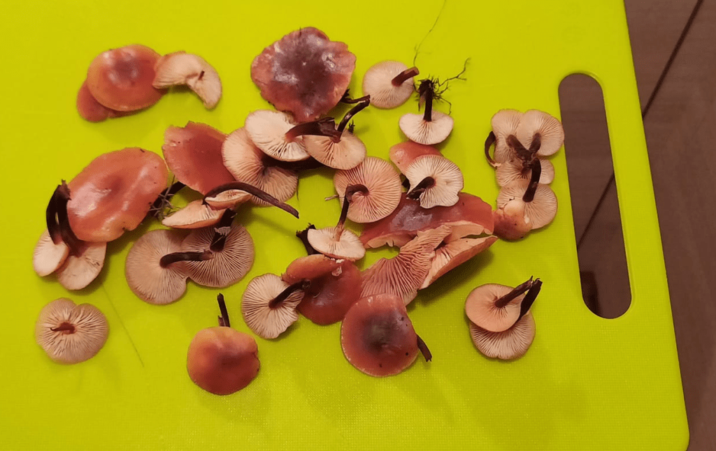 It was bitterly cold, but there is one species that thrives on these kinds of temperatures: Velvet Shanks! There is a lot of gorse along the Deeside Way, so I was hungrily looking out for them. We found a wonderful, pristine patch of them and cooked them in our Ballater kitchen: