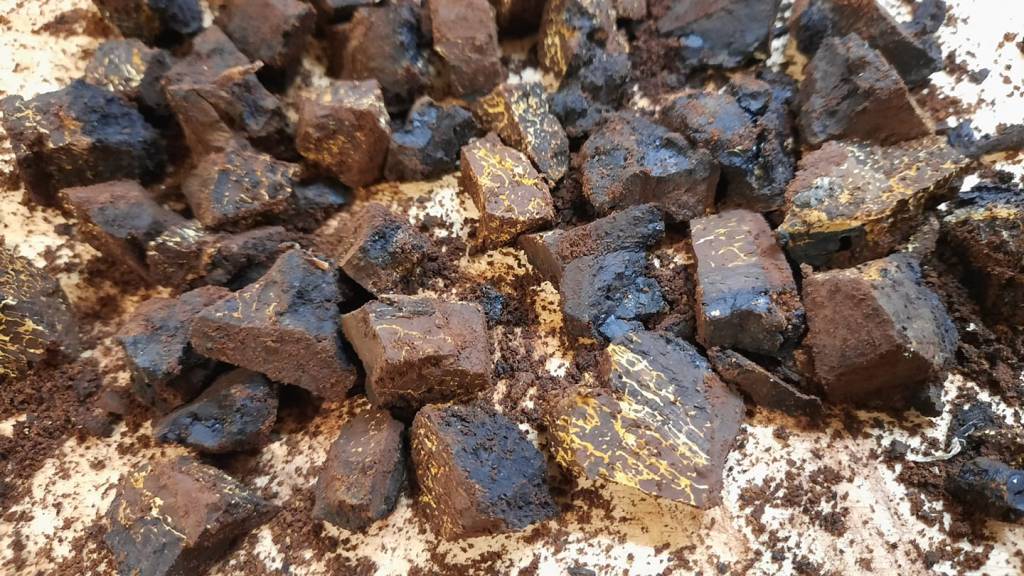 Once cut into smaller pieces, the wonderful golden colour reveals itself. To use it, it needs to be dried thoroughly and then ground or smashed into smaller pieces. These can then be added to coffee or tea (if fine enough) or put in a strainer if the pieces are larger. It has a flavour quite similar to coffee in terms of bitterness, but without the caffeine and a whole shedload of nutrients in its place!