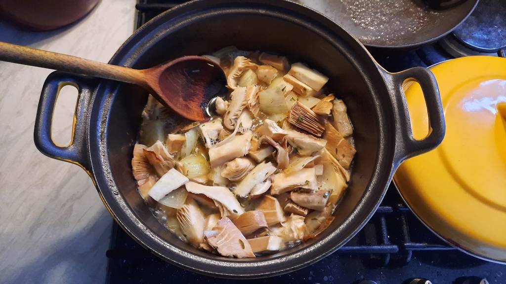 To my amazement, despite their relative maturity, the flesh was in pristine condition. I picked some and left some (a family of beetles was about to set up residence, and while I can live without oysters, they cannot), and made a fabulous soup: