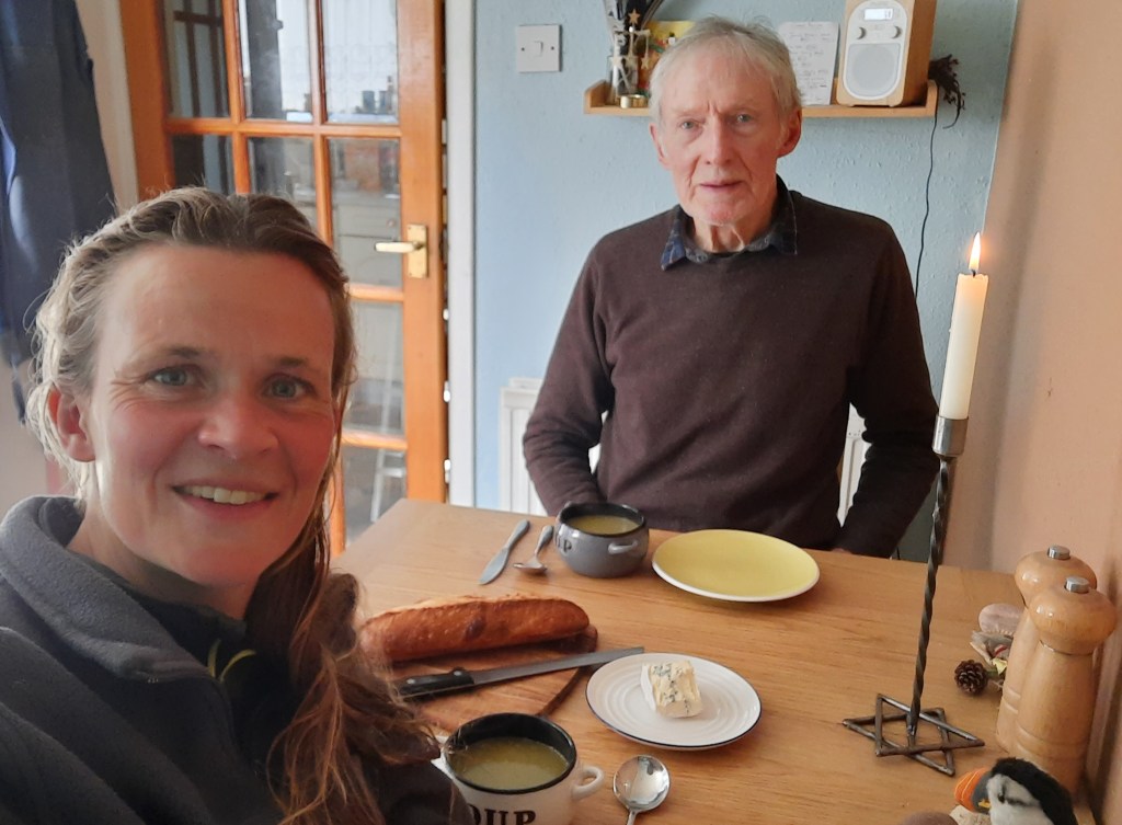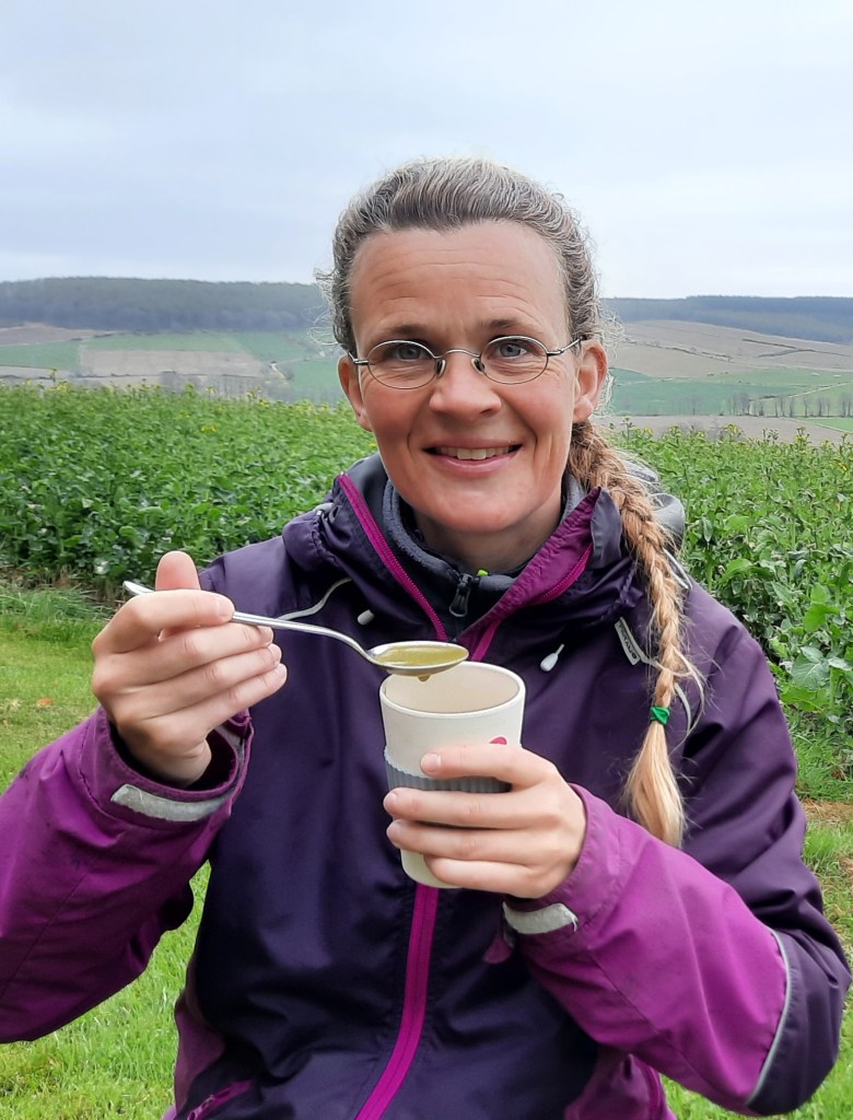 Last night we enjoyed our soup (Ground Elder, potato and onion) and shared a loaf of freshly baked sourdough. Today we took some of the soup with us on a cycling trip and heated it up on the camping stove. Eating it there, out in a field, with all our senses alive, made me feel so grateful for the natural world that we are part of. I said ‘thank you’ to the Ground Elder with every spoonful!