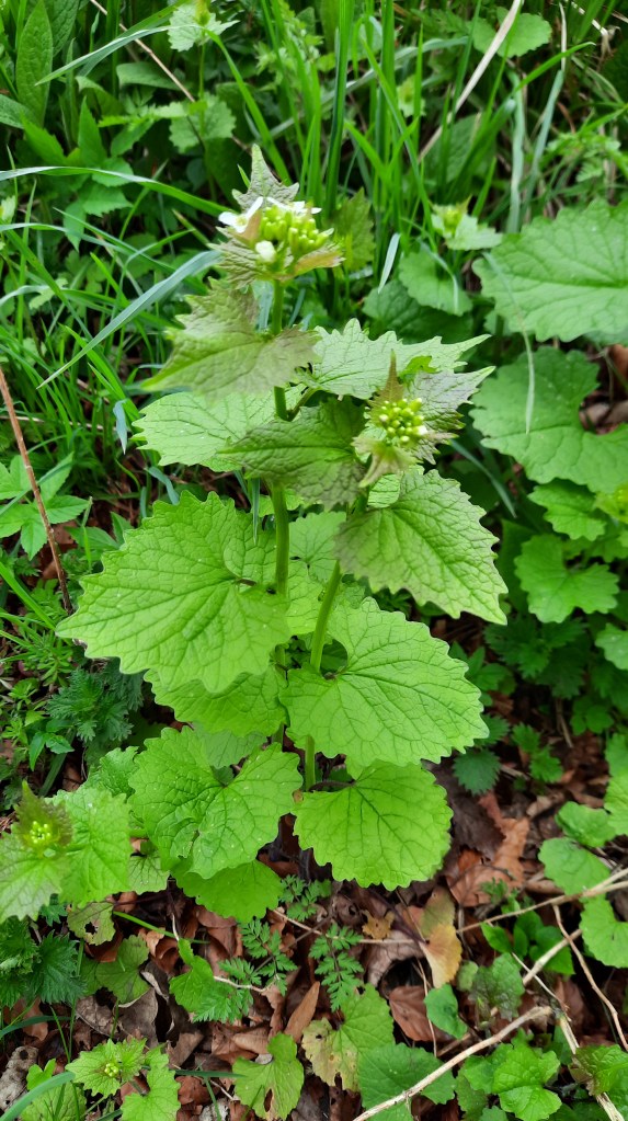 Walking on, I was building the meal in my mind. With the starter sorted, I now concentrated on picking things for the main course. The Garlic Mustard is shooting up, so that went in my bag:
