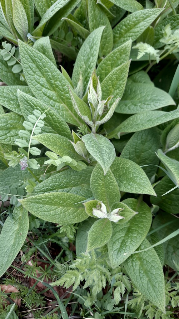 Further along I spotted the first Vetch of the season. They are a member of the pea family. I decided to leave them for the moment as there weren’t very many and I know a bumpy track through the fields where they usually grow in abundance later on in the season. The Comfrey is also making a strong appearance everywhere! Below, the Vetch (small leaves with purple flower) and Comfrey (large leaves) can be seen in the same photo: