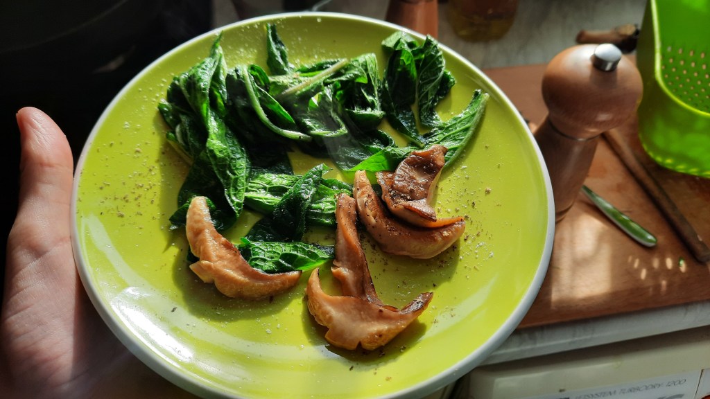 Now, Comfrey is a bit ‘loaded’ in the sense that older sources list it as edible, while more recent sources list it as toxic. In this blog I don’t want to persuade anyone to either eat it or avoid it, so please do your own research and then make your own decision. Personally I believe that our ancestors (who ate Comfrey) probably had a balanced approach to foraging and didn’t exclusively eat one thing all the time. So that’s the approach I will take, too. Comfrey is delicious and a small amount every now and then is what I enjoy. I stir-fried it together with the Spring Cavalier as a starter to my meal: