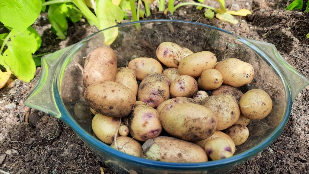 First up are some beautiful potatoes. This bowl is just from one plant. We have 20 plants, so go figure!