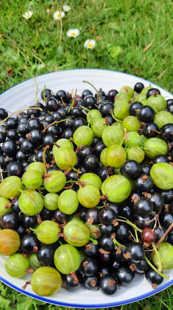 Things are also happening in the fruit department. The Shire is absolutely bursting at the seams! I can cycle about 20 miles in my current state, which is far enough to pick a bounty. It’s an exceptionally good year for cherries. We’ve also got blackcurrants, redcurrants and gooseberries. The other plant on the photo is Pineappleweed, which makes a lovely calming tea. In the background, our elderflower wine is bubbling away nicely.