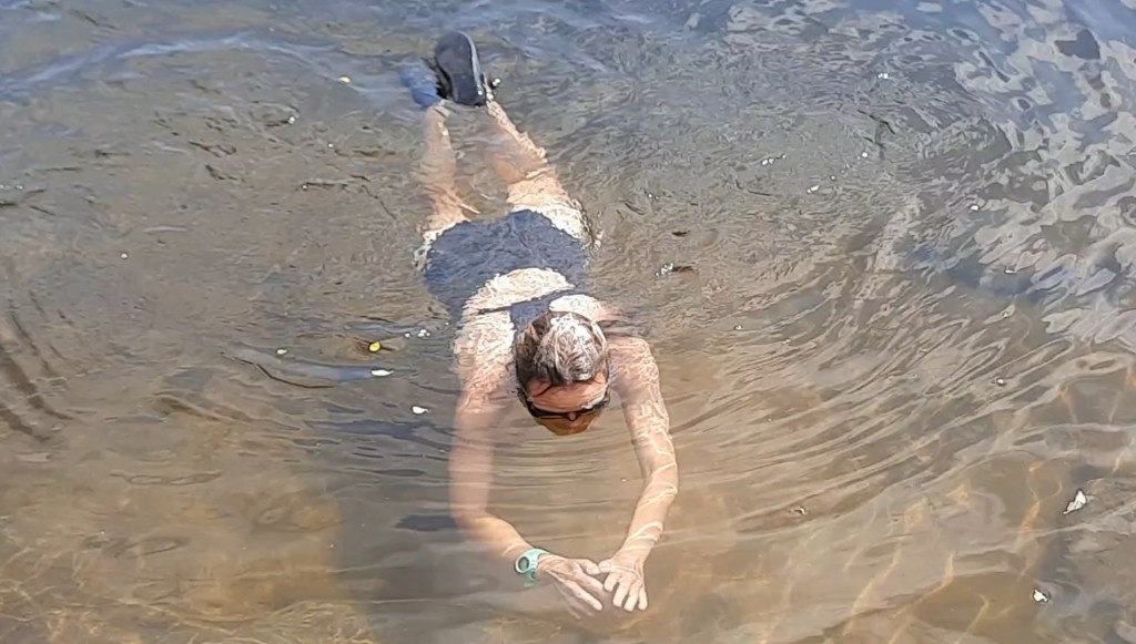 I told my student and they knew me well, as the first question was: “But did you get the cherries?” Ha! Yes, I did. They were delicious. But I’m awaiting a scan and then a likely operation. I still have a little hope that it might be a torn muscle instead. Meanwhile I’m drugged up with very strong painkillers, which enable me to get about just far enough to get some tasty grub. I have been told “no swimming”, but nobody said anything about “no floating”, so that’s what I’ve been doing in the river, just face-down with prescription goggles, observing the plentiful wildlife below: