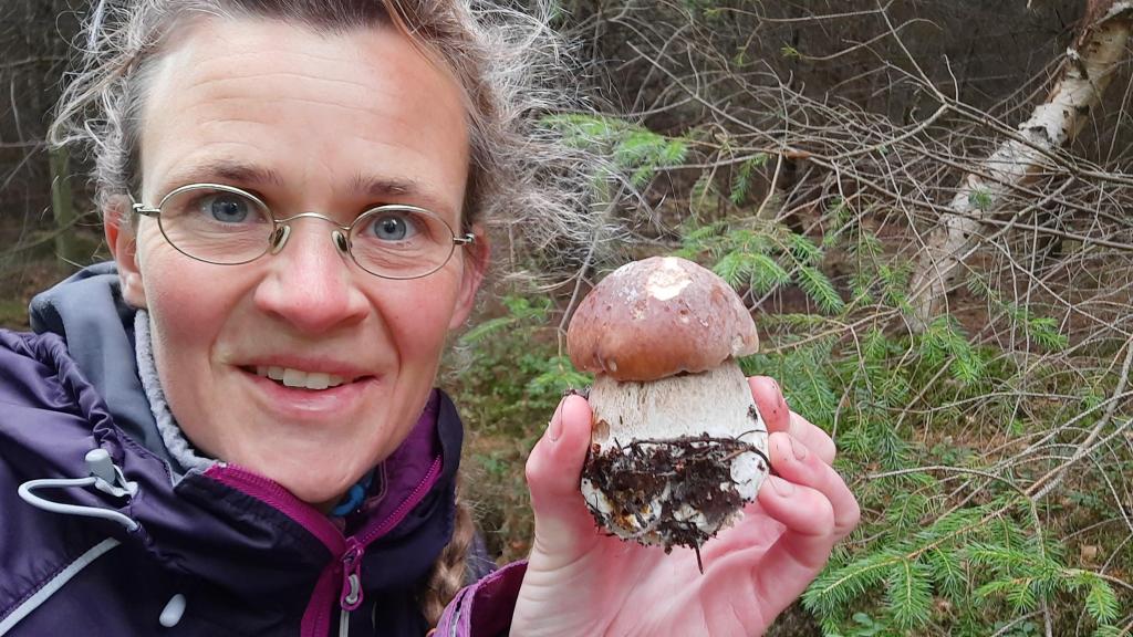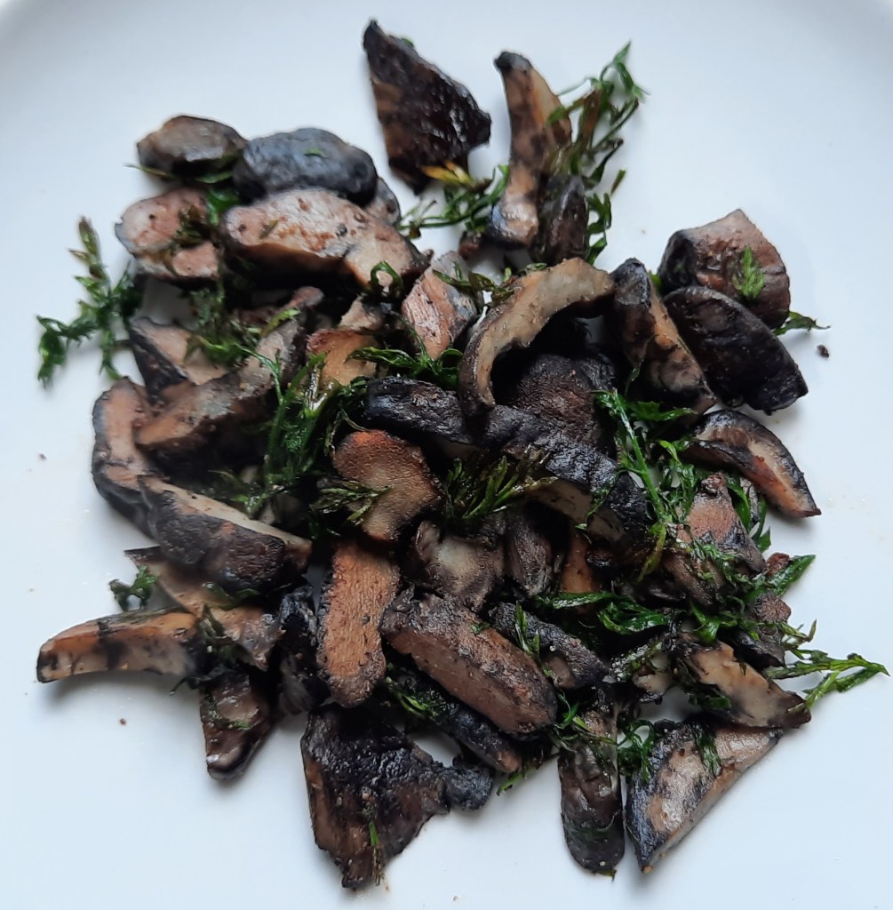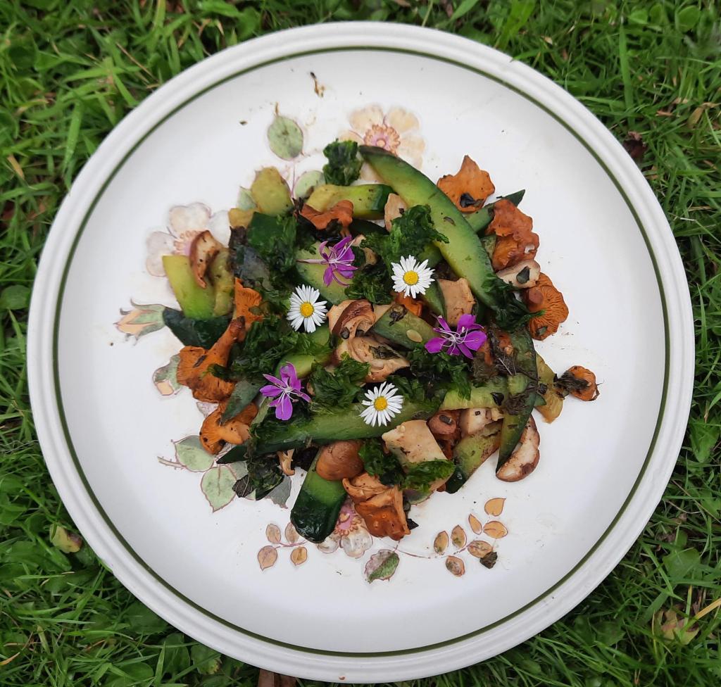 One particular highlight of the week was finding the mushroom species that was the first wild mushroom I ever ate: Boletus edulis, or porcini. I hadn’t expected to find it so soon in the year. Right next to it were some chanterelles, so I cooked them together in another lunchtime stir fry with cucumber, seaweed, sorrel and flowers: