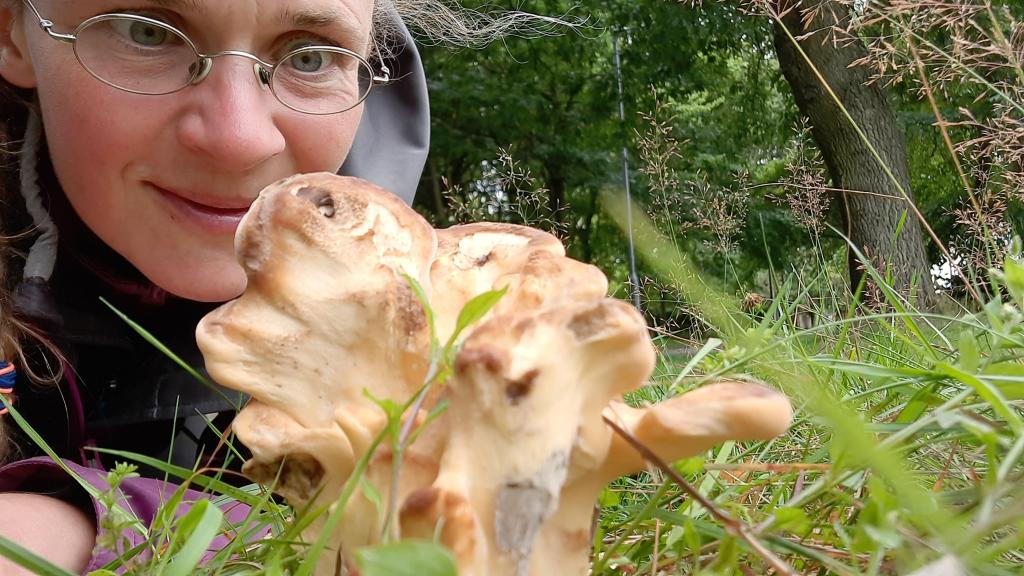 Something else has been popping up this week, going by the rather ominous-sounding name of ‘Giant polypore’. They grow out of the base or roots of (mainly) dead beeches. To eat them, don’t wait until they are the size of monsters – pick them while they’re young. Here’s a picture of me salivating over one: