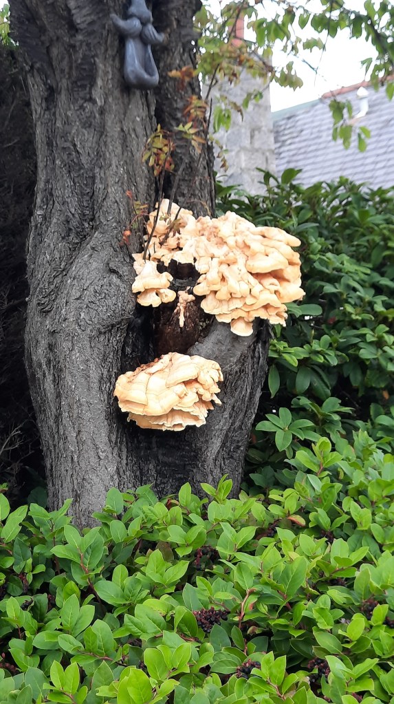 For several months now, I’ve been seeing my foraging friends in England post pictures of this lovely species on Facebook. Despite looking everywhere in Aberdeenshire, so far it had remained elusive. Until last night… I was just walking my ‘fake commute’, but a different route to normal, when I spotted this beautiful collection of yellow growing out of a cherry tree – in someone’s front garden… So I rang the doorbell… I was met by a genuinely friendly guy who offered me even a bag and a knife to get the mushrooms off.