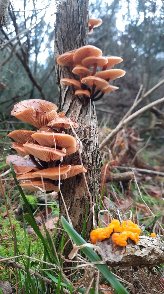 The bright yellow mushroom at the bottom is called Yellow Brain – a name so apt that I might have have given it that myself if I hadn’t known! It’s not edible.