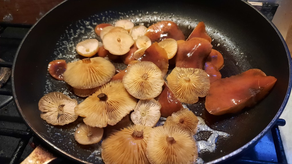 Even in the depth of winter, there is food around for us. Apart from emergency tummy fillers like lichen (some sources say you could survive on them if there’s really nothing else), the Velvet Shanks are now in full swing! I picked some on Christmas Eve and again today:
