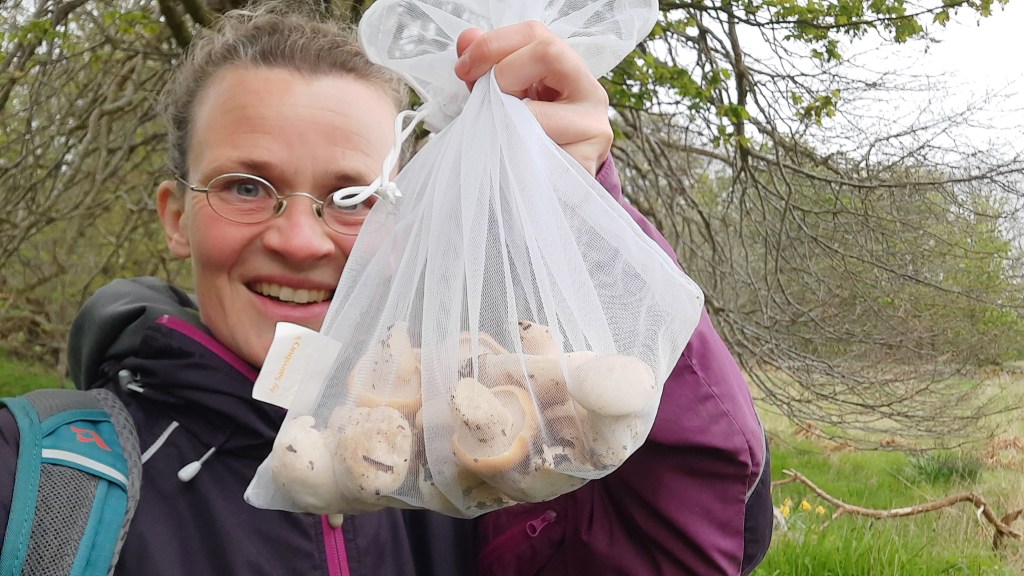 That’s one Happy Forager with a bag full of St. George’s! My Facebook memory tells me that I’ve found them on exactly the same day last year. John made one of his fabulous fluffy mushroom omelettes to celebrate these beauties. I get a real buzz from finding them and cutting them off with my knife. Mushrooms are incredibly satisfying things to hold in your hand – the perfect shape, and they’re nice and cold. Just look at them: