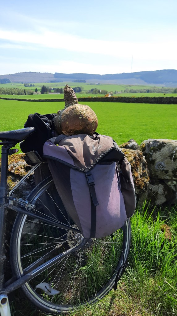 Different countries and regions have their own names for these things, and in Scotland we call them ‘neep’. It’s grown for cattle feed and this one probably had fallen off a trailer. I felt so sorry for it, having grown this big and just being left to rot. So despite the colossal weight that made my bike feel decidedly out of balance, I cycled 15 miles home with it.