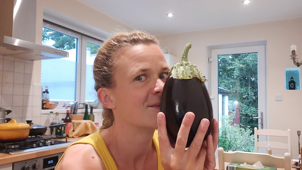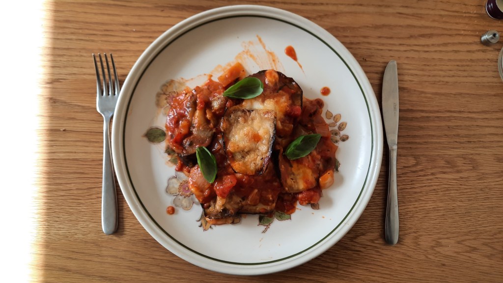 In our greenhouse and on the windowsill, things are also happening. A few days ago I found myself the proud ‘parent’ of my first ever aubergine. It was huge and the colour intensely purple. I’ve done it justice in a wonderful oven bake with tomato and cheese.