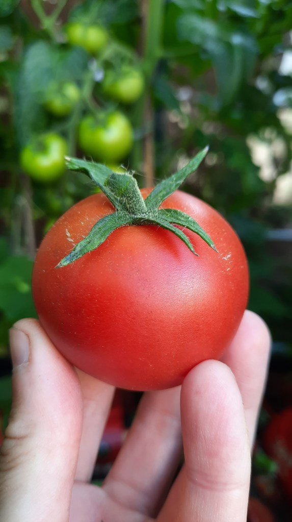 Finally, my rescue tomato plant Shirley is bearing fruit! What an awesome transformation that has been, from near-death to absolutely thriving. Sadly her inaugural consumption took place in torrential rain today, but I did enjoy it!