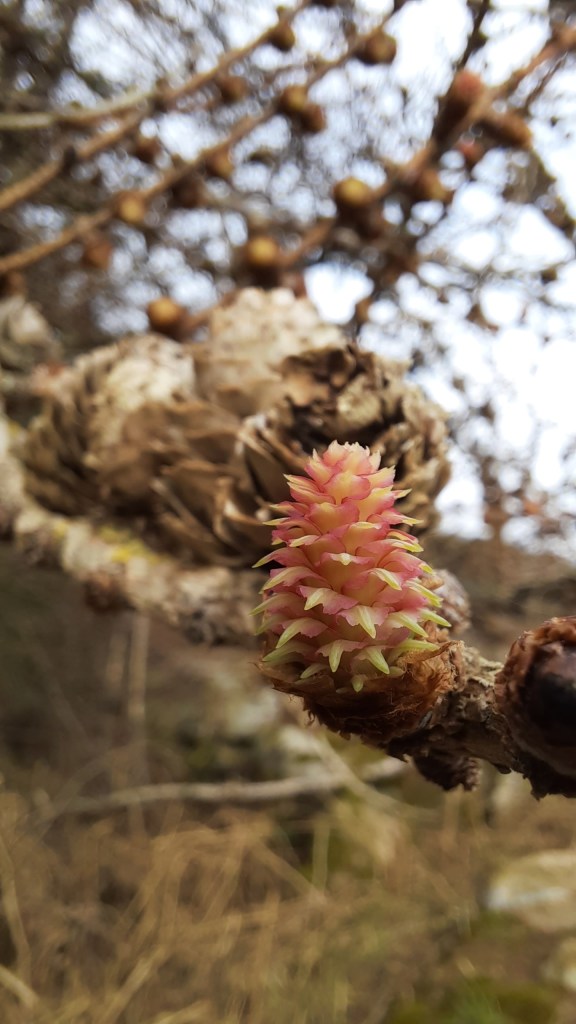 A few weeks ago the first hesitant larch flowers appeared. The female ones (in the picture above) are pink and upright. Once fertilized, they will become the seed-bearing cones that you can see in the background. The male flowers are much less showy, small green dangly things ðŸ¤. They’re all edible, but I couldn’t bring myself to eating something this cute.