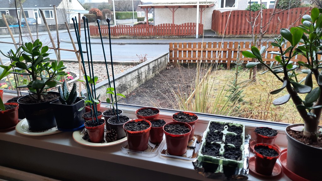 Talking of small green things, the first of our runner beans have sprouted. John has built a kind of wigwam in a planter in the front garden (you can just about see it in the background of the picture), where they are to live once they get a little bit bigger.